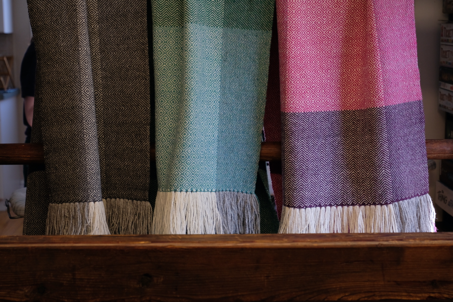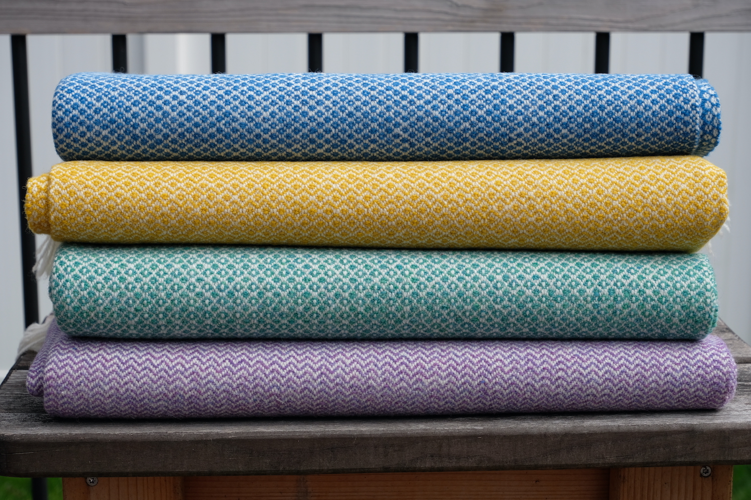 Elena works in 100% natural wool and cotton. Her inventory includes blankets, scarves, towels, napkins, and decorative wall hangings. Custom commissions are also available.
